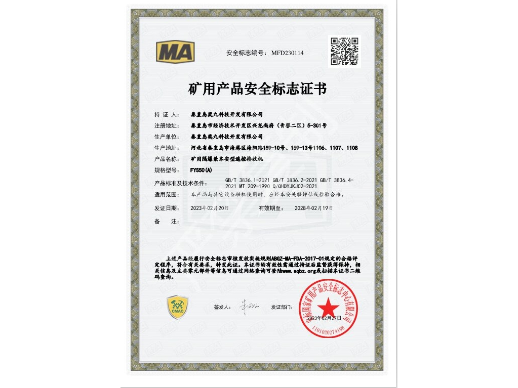 礦用產(chǎn)品安全標志證書